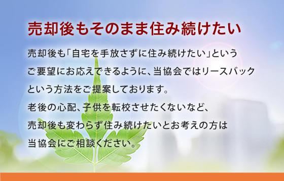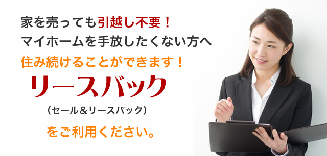 不動産を売却した後に、信頼できる個人投資家や投資会社など、第三者に一旦、不動産を買い取ってもらい、その家主と賃貸契約を結ぶことです。住宅ローンが支払えず住み慣れた我が家にどうしても住み続けたい、思ったより退職金や年金が少なく今後の生活に不安、自宅を残しても相続させる人がいない、子供を転校させたくない。そんな方はリースバックをおすすめします。